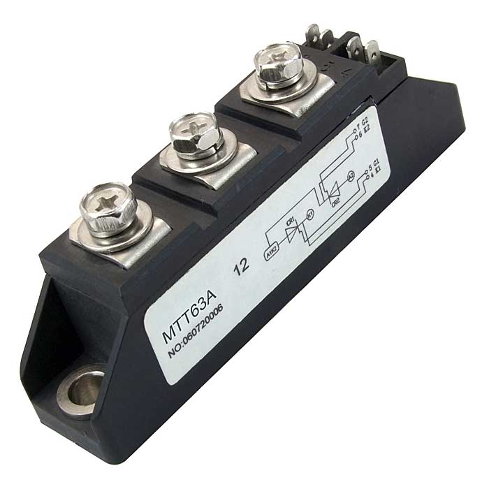 Силовой тиристорный модуль МТТ представляет собой от двух до нескольких мощных тиристоров, расположенных в одном корпусе, соединенных по определенной схеме, которые выполняют роль мощных ключей на токи от 63А до 500А. Модуль МТТ63 расчитан на ток до 63 ампер.Для отвода тепла могут быть использованы охладители марок: (115х100х80), BLA062-100, BLA143-100, BLA148-100, BLA295-100. К модулям рекомендуются провода управления.